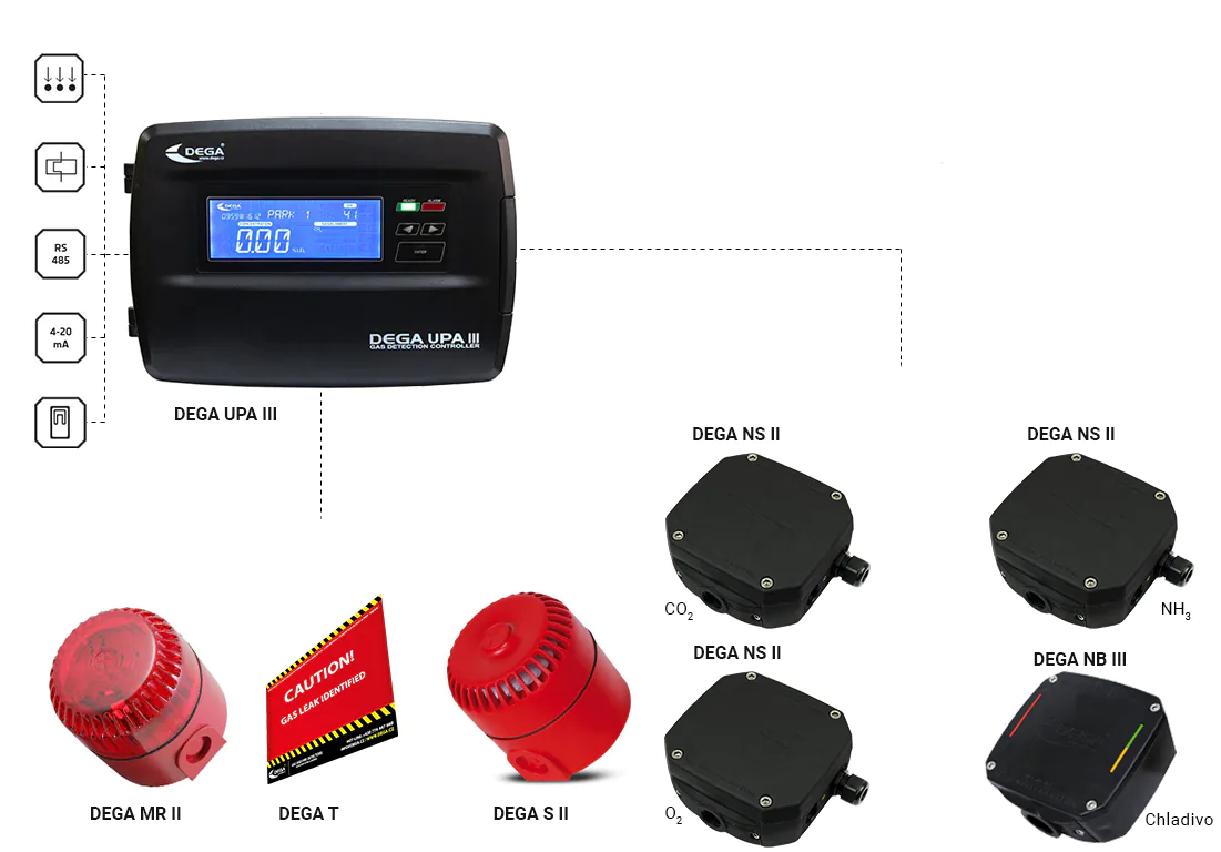 Rovnako ako v prípade všetkých našich systémov monitorovania plynov môžeme distribuovať viac signálov do vášho bezpečnostného vybavenia, ako je ovládanie vetrania, v chladných miestnostiach, aby sme zabezpečili, že tieto bezpečnostné kontroly sa aktivujú pri dosiahnutí úrovne poplachu.