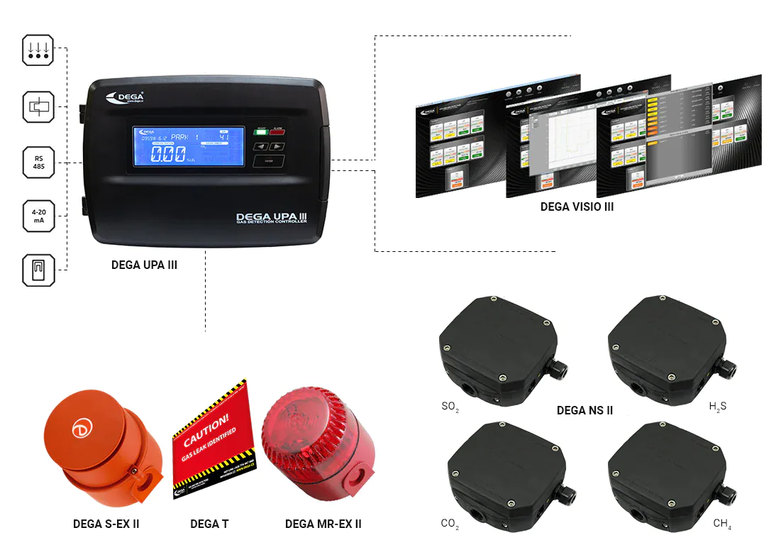 Naše plne na mieru navrhnuté systémy možno dodatočne namontovať a tiež novo integrovať do procesov čistenia odpadových vôd a bioplynu. Naše zariadenia sú mimoriadne robustné a môžu byť inštalované v drsnom prostredí, aby sa zabezpečilo monitorovanie všetkých miest. Najmä v systémoch odsávačov pár sa CO2 monitoruje ako hlavný vedľajší produkt. Čistiarne odpadových vôd sú vo všeobecnosti monitorované na prítomnosť metánu a sírovodíka, naše systémy môžu byť pripojené k existujúcemu systému výfukových ventilátorov a povolené, ak sú prítomné limitné koncentrácie alarmu. V predvolenom nastavení máme viacero analógových a digitálnych výstupov, ktoré dokážu aktivovať vizuálne aj zvukové alarmy, t.j. majáky / sirény.