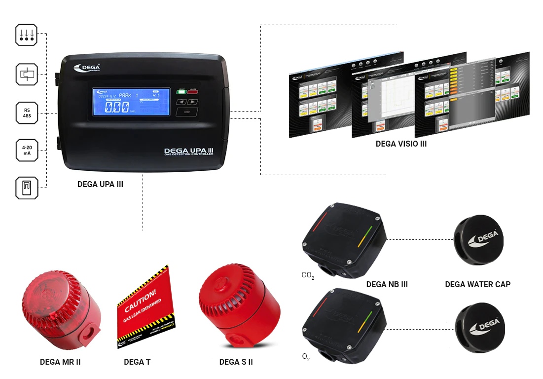 Stejně jako u všech našich monitorovacích systémů můžeme distribuovat více signálů do vašeho bezpečnostního zařízení, jako je ovládání ventilace, abychom zajistili, že tyto bezpečnostní ovládací prvky budou aktivovány při dosažení úrovní předalarmu.