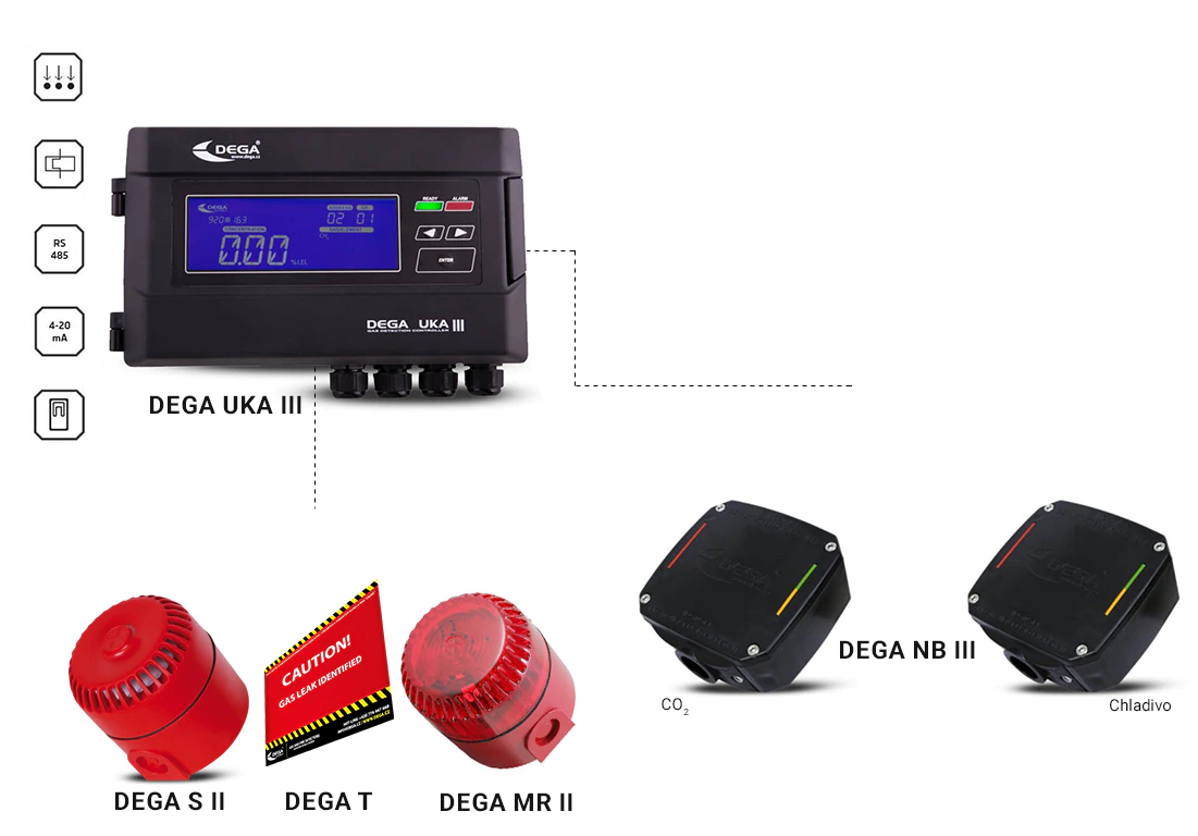K dispozici jsou také ústředny, které pokrývají malé systémy 4 snímačů až po sofistikovanější systémy 250 snímačů. Všechny naše ústředny mají vnitřní paměť pro uchování historie alarmů pro diagnostiku trendů. Všechny naše ústředny a snímače lze připojit k audiovizuálním indikátorům, jako jsou sirény a majáky, které mohou být také součástí řešení.